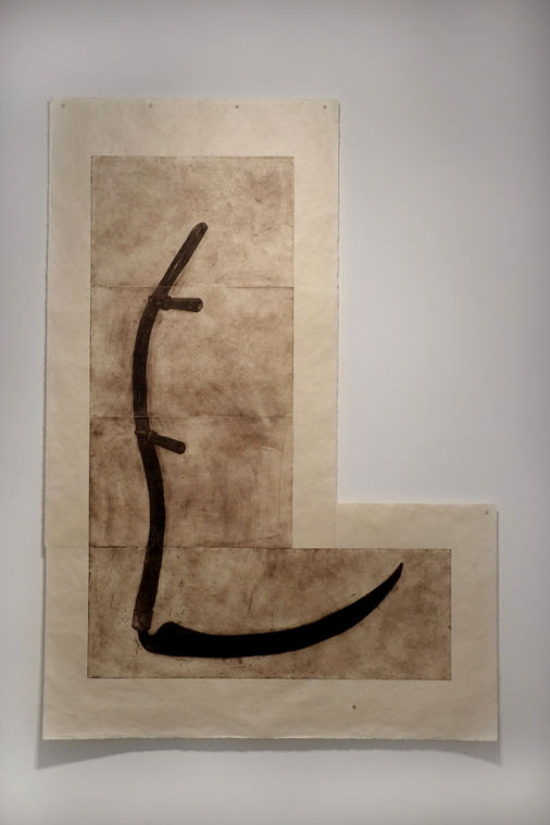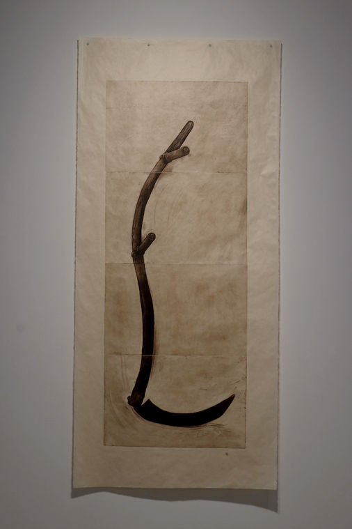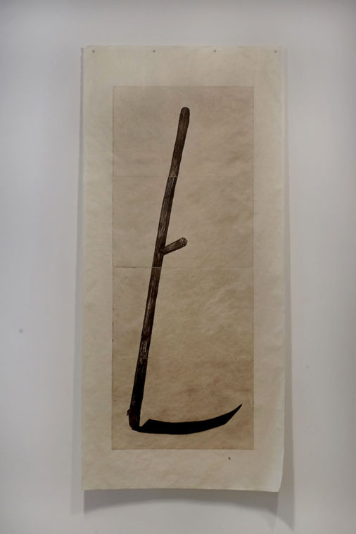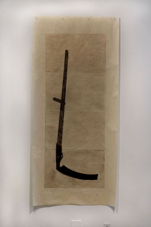 The scythe is a tool, an object of agrarian labour. Romantic imagery in art and literature of cutting hay in the steppes of eastern Europe is brought to the history of my own family in my most recent work, Four Oldest Daughters. In these large-scale etchings life-sized representations of scythes stand-in metaphorically for four women in my family that were oldest daughters, including myself – four generations of women from agricultural backgrounds, each of whom has encouraged a strong work ethic. I remember my paternal grandmother using one of these scythes with expertise when cutting tall grasses in our families’ farmyards north of Saskatoon – a part of her agrarian cultural background experienced in the Ukraine. As oldest daughters my mother Stella, both of my grandmothers, as well as myself, were expected to look after younger members of the family and do the chores on the farm. At times many such oldest daughters were expected to leave school early to contribute to the family farm. In this body of work I am celebrating and honoring women who gave up their education and worked so hard to support their parents and younger siblings? I have included myself in this series of scythe prints as a metaphorical stand-in because I am a composite of these three women.