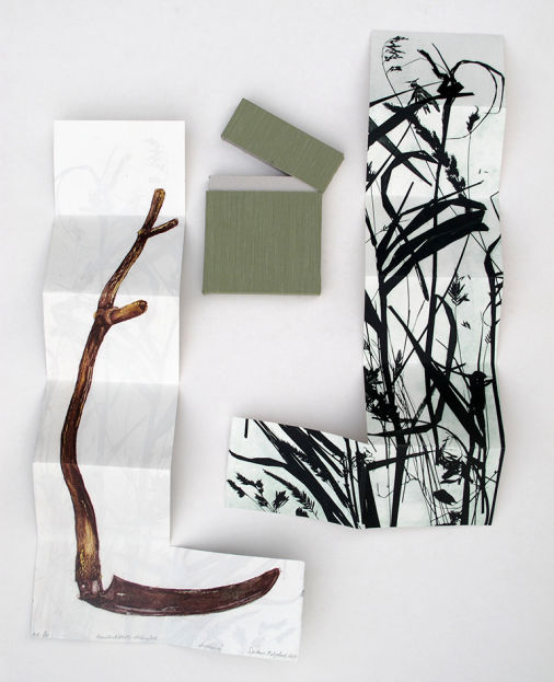 My interest in rural agrarian culture and my Ukrainian heritage is based in peasant iconography. In artworks such as the etching Irradiated Cabbage and the artist’s book Travelling in Ukraine, I use gardening and food imagery – something as simple as a cabbage used in cabbage rolls can be aesthetized and made beautiful. Through these and related artworks I ask such questions as: “what is hard, physical work?” and “why do we have a longing for an uncomplicated lifestyle when it comes to living and observing a rural landscape?". General interests in cultural ethnography, memory, family history or family stories, food and garden imagery are recurrent in these artworks. Travelling in Ukraine depicts a woman that I met in the Ukrainian village of Ivankiev, where my grandfather emigrated from in 1903. She is harvesting jasmine leaves for drying and selling in a larger city. A patch of cabbages in a farm field fills the other side of this accordion book.